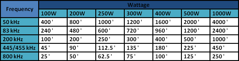 Berikut adalah tabel untuk memberi gambaran seberapa banyak fish finder yang bisa memberi Anda kombinasi kekuatan / frekuensi tertentu (ini adalah bilangan konservatif, kedalaman sebenarnya yang akan Anda dapatkan akan lebih tinggi):