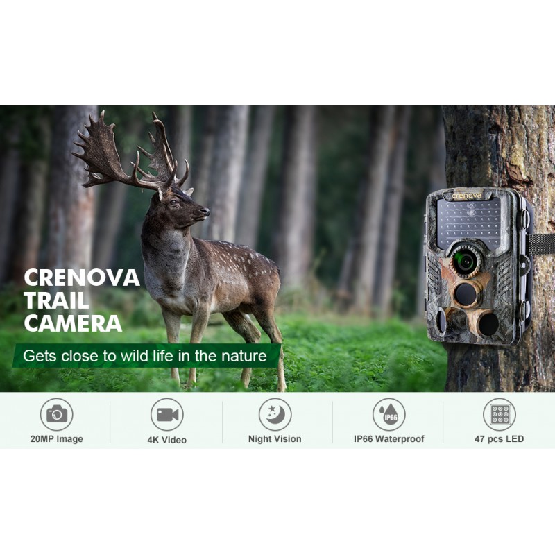 Crenova 20MP 1080P HD Trail Camera dengan Kartu 32GB Diperbarui ke LED IR 940nm dan Kamera Game Tahan Air IP66, Penglihatan Malam yang Diaktifkan Gerakan Sempurna untuk Pengamatan Satwa Liar.