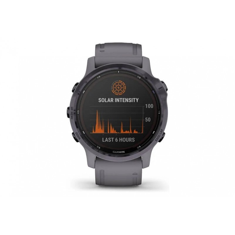 fēnix 6S Pro Solar Amethyst Steel with Shale Gray Band adalah jam yang memanfaatkan tenaga surya. Dilengkapi fitur lensa pengisian daya surya Power Glass dan mode manajer daya custom, jam tangan ini siap digunakan untuk berminggu-minggu.